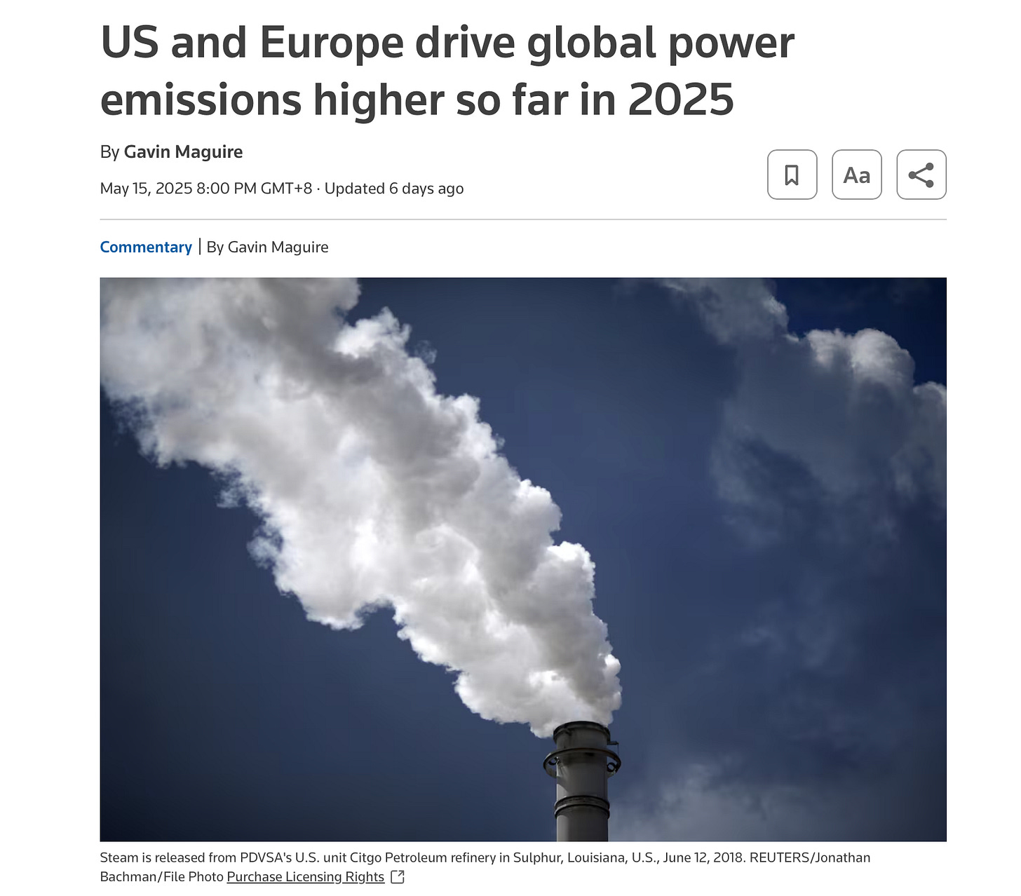 The article particularly highlights a bleak outlook for future emissions reductions in the U.S.. With electricity demand steadily increasing and the new administration strongly supporting fossil fuels, there is little incentive for related industries to cut emissions. Additionally, rising natural gas prices have prompted a shift toward coal, which is more polluting. From January to March this year, U.S. coal-fired power generation surged by 23% compared to the same period in 2024, while gas-fired power generation declined by 4%.